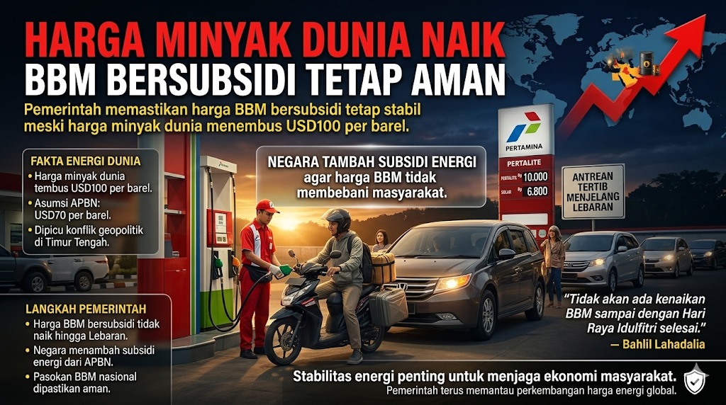 Jakarta — Setiap kali harga minyak dunia melonjak, kekhawatiran masyarakat biasanya langsung tertuju pada potensi kenaikan harga bahan bakar di dalam negeri. Bagi jutaan masyarakat yang bergantung pada BBM bersubsidi untuk aktivitas sehari-hari, stabilitas harga energi menjadi faktor penting dalam menjaga pengeluaran rumah tangga tetap terkendali. Terlebih menjelang bulan Ramadan dan Hari Raya Idulfitri, ketika mobilitas dan kebutuhan masyarakat meningkat, kepastian harga BBM menjadi hal yang sangat dinantikan agar masyarakat dapat menjalankan aktivitas dan persiapan hari raya dengan lebih tenang.