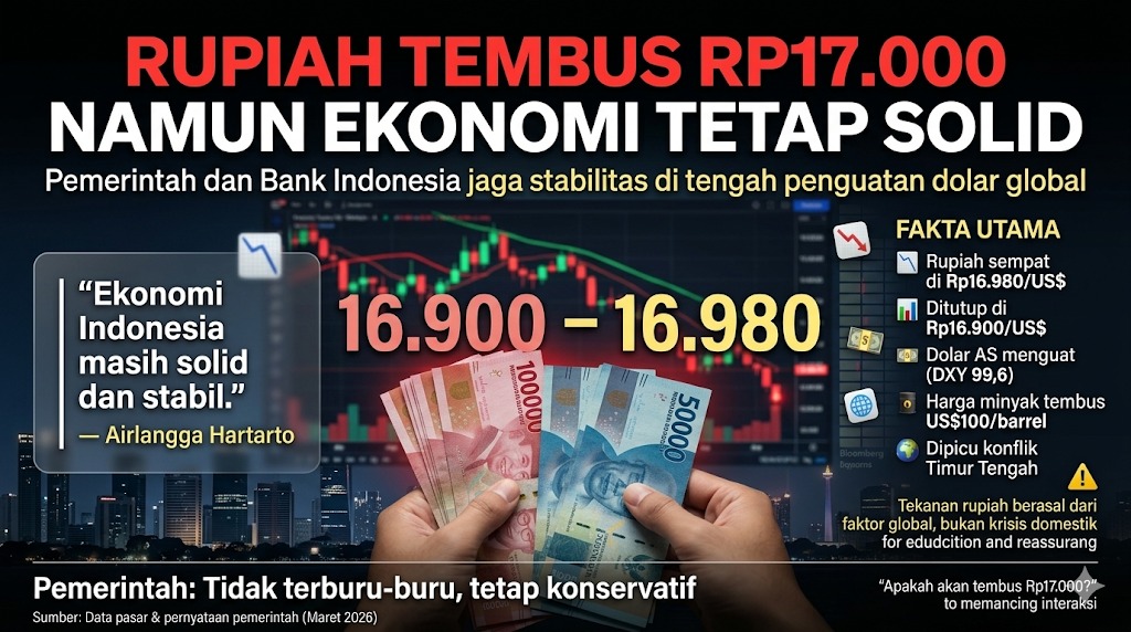 Situasi ini terlihat dalam perdagangan terbaru ketika rupiah dibuka melemah sebesar 0,47% ke posisi Rp16.980 per dolar AS dan ditutup turun 0,15% di level Rp16.900 per dolar AS, berdasarkan data Refinitiv. Pelemahan ini terjadi di tengah penguatan dolar AS secara global yang tercermin dari naiknya indeks dolar (DXY) hingga mencapai level 99,655, mendekati posisi tertinggi dalam lebih dari tiga bulan. Menteri Koordinator Bidang Perekonomian, Airlangga Hartarto, pada Senin, 16 Maret 2026 di Jakarta, menyampaikan bahwa pemerintah bersama Bank Indonesia terus bersinergi dalam menjaga stabilitas rupiah. Ia menegaskan bahwa tugas menjaga nilai tukar berada pada Bank Indonesia, sementara pemerintah fokus menjaga kondisi makroekonomi tetap kuat dan terkendali. Selain itu, pemerintah memilih untuk tidak terburu-buru dalam merespons tekanan eksternal yang memengaruhi pergerakan rupiah.