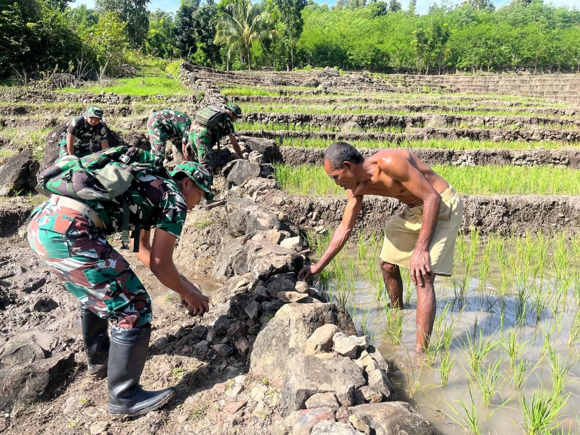 Timor Tengah Utara – Satgas Pengamanan Perbatasan (Pamtas) RI-RDTL Sektor Barat Yonarhanud 2 Kostrad Pos Nino melaksanakan karya bakti membantu perbaikan tanggul pengairan sawah milik warga di Desa Nino, Kecamatan Bikomi Nilulat, Kabupaten Timor Tengah Utara (TTU), Minggu (12/4). Kegiatan ini dilakukan untuk mengatasi kendala distribusi air ke lahan pertanian warga sekaligus mendukung peningkatan hasil panen.