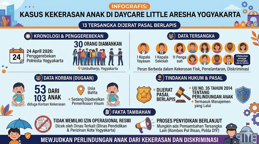YOGYAKARTA, 27 April 2026 — Kepolisian Resor Kota (Polresta) Yogyakarta menetapkan 13 tersangka dalam kasus dugaan kekerasan terhadap anak di tempat penitipan (daycare) Little Aresha, Umbulharjo, Yogyakarta, setelah penggerebekan pada Jumat (24/4/2026). Para tersangka terdiri dari satu kepala yayasan, kepala sekolah, dan 11 pengasuh, yang diduga melakukan kekerasan fisik, penelantaran, serta tindakan diskriminatif terhadap puluhan balita. Penetapan tersangka dilakukan berdasarkan hasil evaluasi alat bukti dan keterangan saksi, dengan ancaman pasal berlapis dalam Undang-Undang Nomor 35 Tahun 2014 tentang Perlindungan Anak.