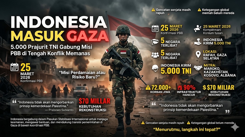 Perserikatan Bangsa-Bangsa (PBB) mengonfirmasi keterlibatan Indonesia dalam Pasukan Stabilisasi Internasional (ISF) di Jalur Gaza bersama empat negara lain, yakni Maroko, Kazakhstan, Kosovo, dan Albania. Keputusan ini disampaikan dalam sidang Dewan Keamanan PBB pada 25 Maret 2026 sebagai bagian dari upaya global menstabilkan wilayah konflik yang masih bergejolak pasca gencatan senjata sejak Oktober 2025.