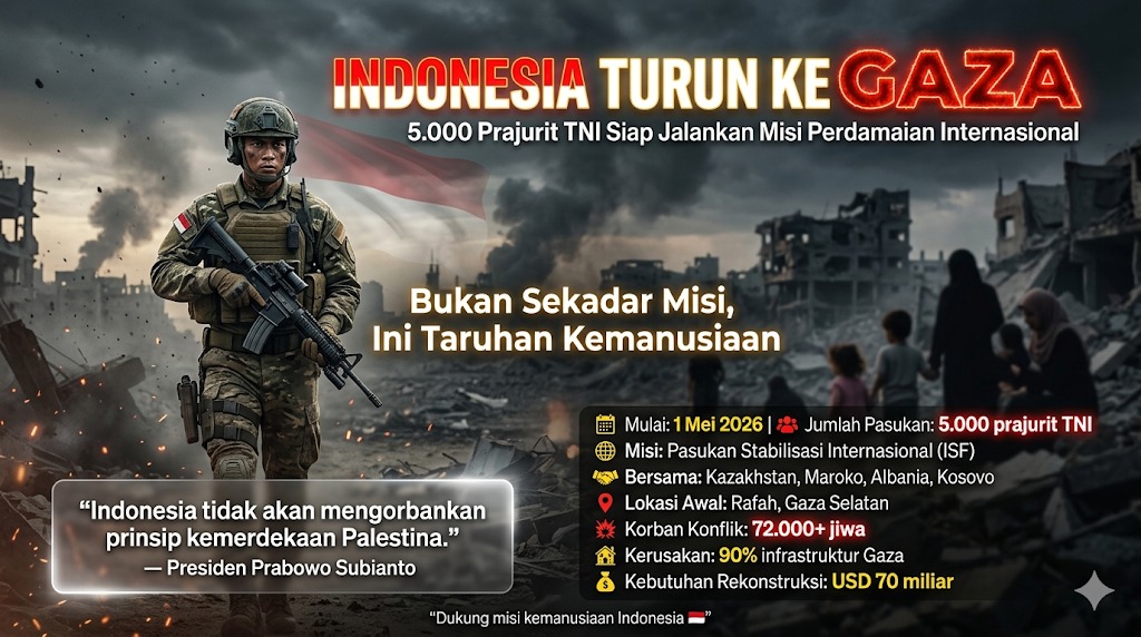 Pemerintah Indonesia melalui kepemimpinan Presiden Prabowo Subianto berencana mengirim 5.000 prajurit Tentara Nasional Indonesia (TNI) ke Jalur Gaza mulai 1 Mei 2026 sebagai bagian dari Pasukan Stabilisasi Internasional (ISF). Pengerahan ini dilakukan untuk mendukung pemulihan keamanan dan kemanusiaan di wilayah konflik, sejalan dengan implementasi tahap kedua “Rencana 20 Poin” yang digagas oleh Donald Trump.