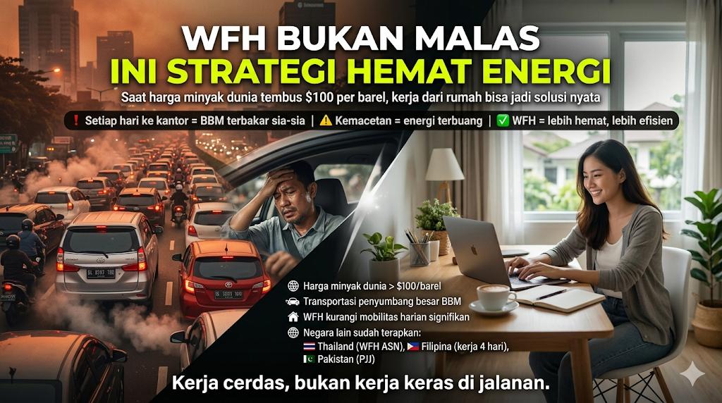 Jakarta — Di tengah hiruk-pikuk kota yang tak pernah benar-benar tidur, ada satu hal yang kerap luput dari perhatian kita: setiap liter bahan bakar yang terbakar di jalanan adalah bagian dari krisis yang perlahan mendekat. Kemacetan bukan lagi sekadar soal waktu yang terbuang, melainkan juga tentang energi yang terkuras tanpa kendali. Ketika harga minyak dunia melonjak dan ketidakpastian global semakin nyata, masyarakat dihadapkan pada kenyataan bahwa kebiasaan sehari-hari pun memiliki konsekuensi besar. Dalam situasi seperti ini, gagasan bekerja dari rumah atau work from home (WFH) tidak lagi sekadar pilihan gaya hidup, melainkan menjadi kebutuhan strategis yang menyentuh kepentingan bersama.