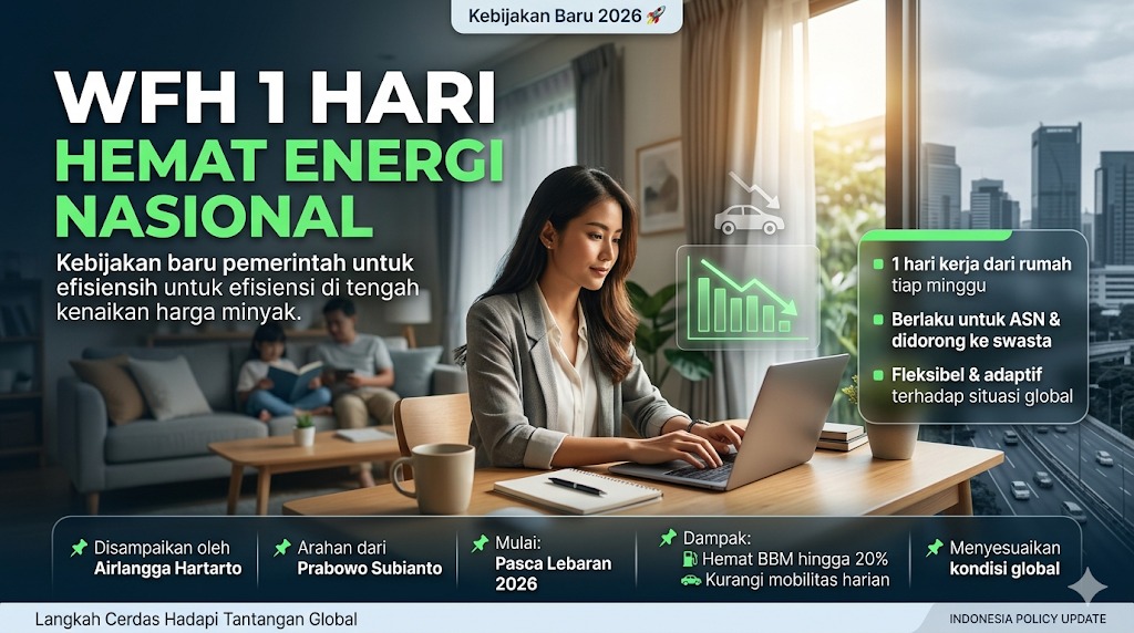 Pemerintah melalui Menteri Koordinator Bidang Perekonomian, Airlangga Hartarto, mengumumkan rencana penerapan kebijakan work from home (WFH) satu hari dalam sepekan pasca Lebaran 2026. Kebijakan ini disampaikan usai rapat bersama Prabowo Subianto di Kompleks Istana Kepresidenan Jakarta. Tidak hanya berlaku bagi aparatur sipil negara, pemerintah juga mendorong sektor swasta dan pemerintah daerah untuk ikut menerapkan kebijakan serupa. Langkah ini diambil sebagai respons atas meningkatnya harga minyak dunia, dengan tujuan utama mengurangi mobilitas harian yang berkontribusi pada konsumsi bahan bakar. Meski teknis pelaksanaannya masih dalam tahap penyusunan, kebijakan ini direncanakan akan mulai diberlakukan setelah Lebaran, dengan penyesuaian terhadap perkembangan situasi global.