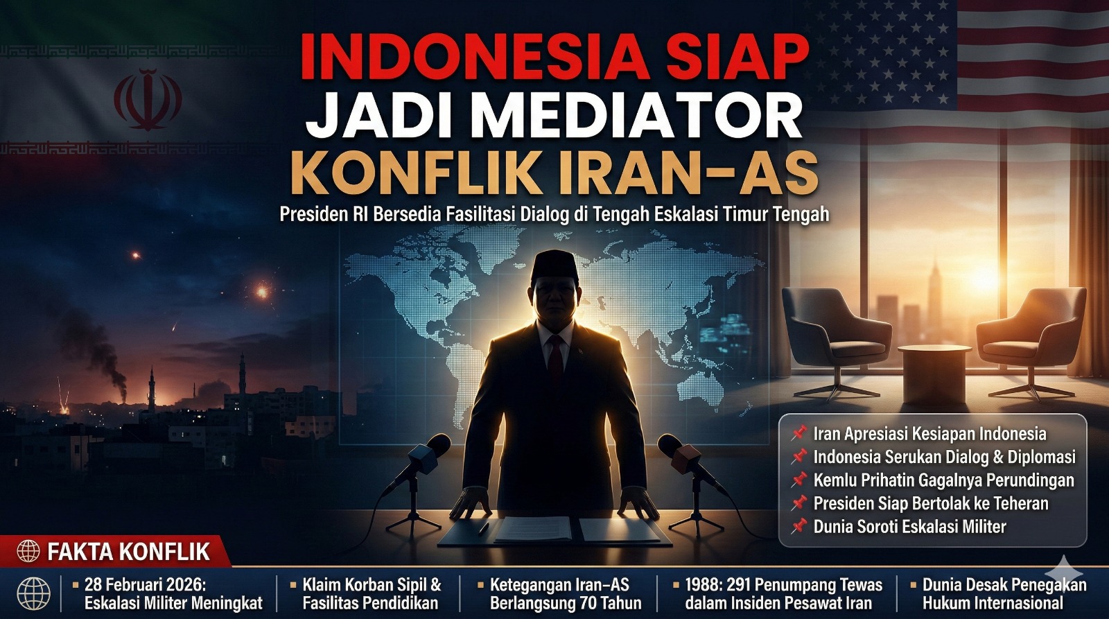 Kedutaan Besar Republik Islam Iran di Indonesia secara resmi menyampaikan apresiasi atas kesiapan Presiden RI, Prabowo Subianto, untuk menjadi mediator dalam konflik antara Amerika Serikat dan Iran yang turut melibatkan Israel. Pernyataan tersebut dirilis di Jakarta pada Minggu, 1 Maret 2026. Kedubes Iran menyampaikan terima kasih atas dukungan konsisten Pemerintah dan rakyat Indonesia serta menyambut kesiapan Presiden RI untuk memfasilitasi dialog guna meredakan ketegangan di Timur Tengah. Namun, di saat yang sama, Kedubes Iran juga meminta pemerintah Indonesia mengambil sikap tegas dalam mengecam apa yang mereka sebut sebagai agresi dan pelanggaran hukum internasional oleh Amerika Serikat dan Israel. Sebelumnya, Kementerian Luar Negeri RI telah menyatakan keprihatinan mendalam atas gagalnya perundingan antara AS dan Iran yang berdampak pada meningkatnya eskalasi militer. Indonesia menyerukan semua pihak menahan diri, mengedepankan diplomasi, serta menghormati kedaulatan dan integritas wilayah masing-masing negara. Bahkan Presiden Prabowo disebut bersedia bertolak langsung ke Teheran jika kedua pihak menyetujui upaya mediasi tersebut.