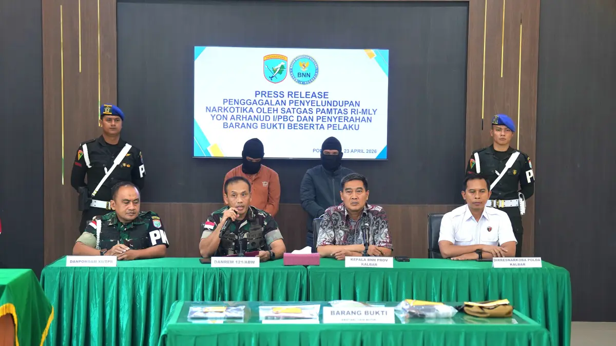 Komando Daerah Militer (Kodam) XII/Tanjungpura menyerahkan dua tersangka kasus penyelundupan narkotika beserta barang bukti 1.659 butir pil ekstasi kepada Badan Narkotika Nasional Provinsi (BNNP) Kalimantan Barat, Kamis (23/4/2026), di Aula Mapomdam XII/Tanjungpura, sebagai tindak lanjut proses hukum atas hasil penindakan di wilayah perbatasan RI–Malaysia.