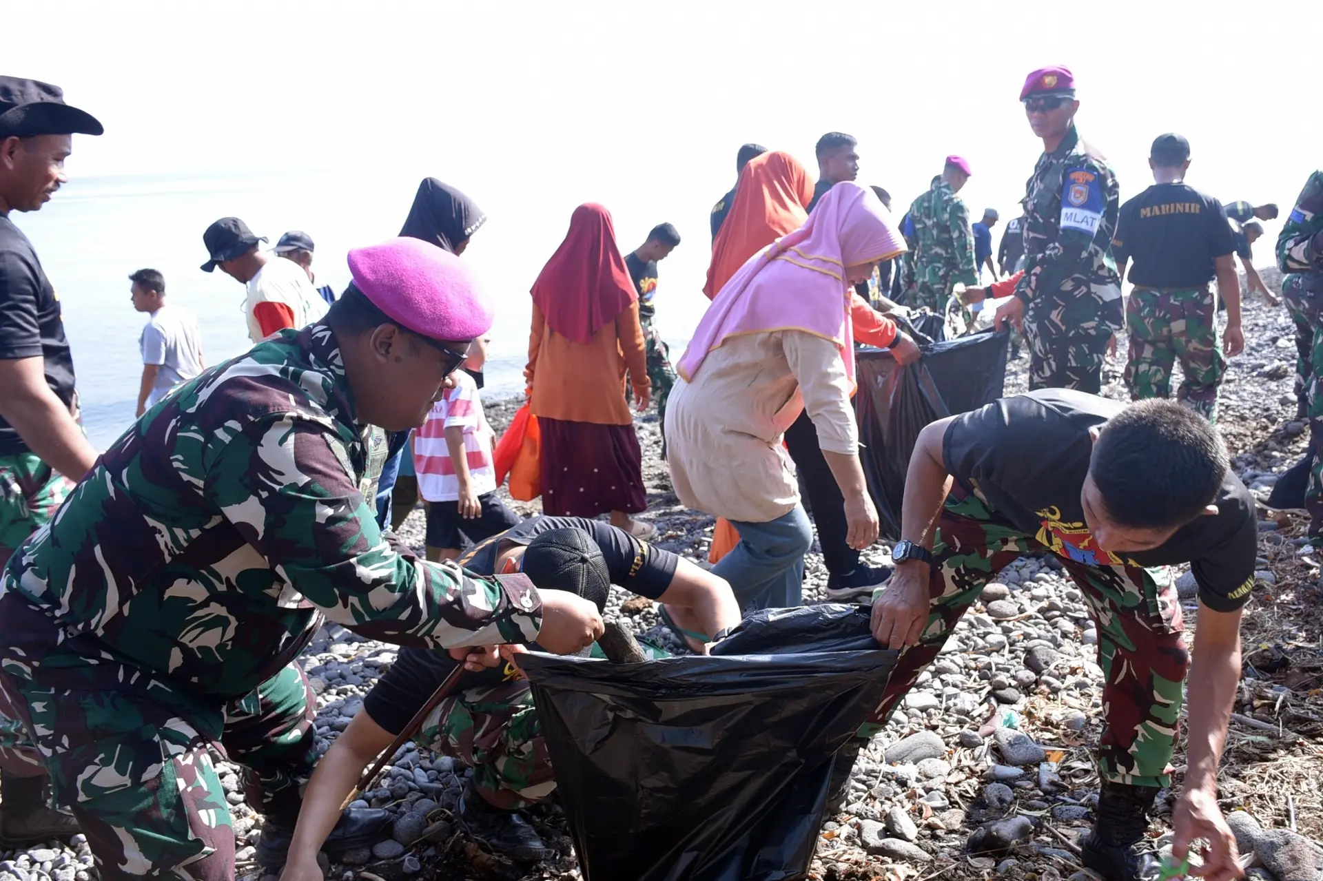 Aksi bersih pantai tersebut juga melibatkan partisipasi aktif warga dan pelajar setempat. Selain itu, prajurit Marinir turut menyalurkan bantuan sembako kepada masyarakat pesisir sebagai bentuk kepedulian sosial.