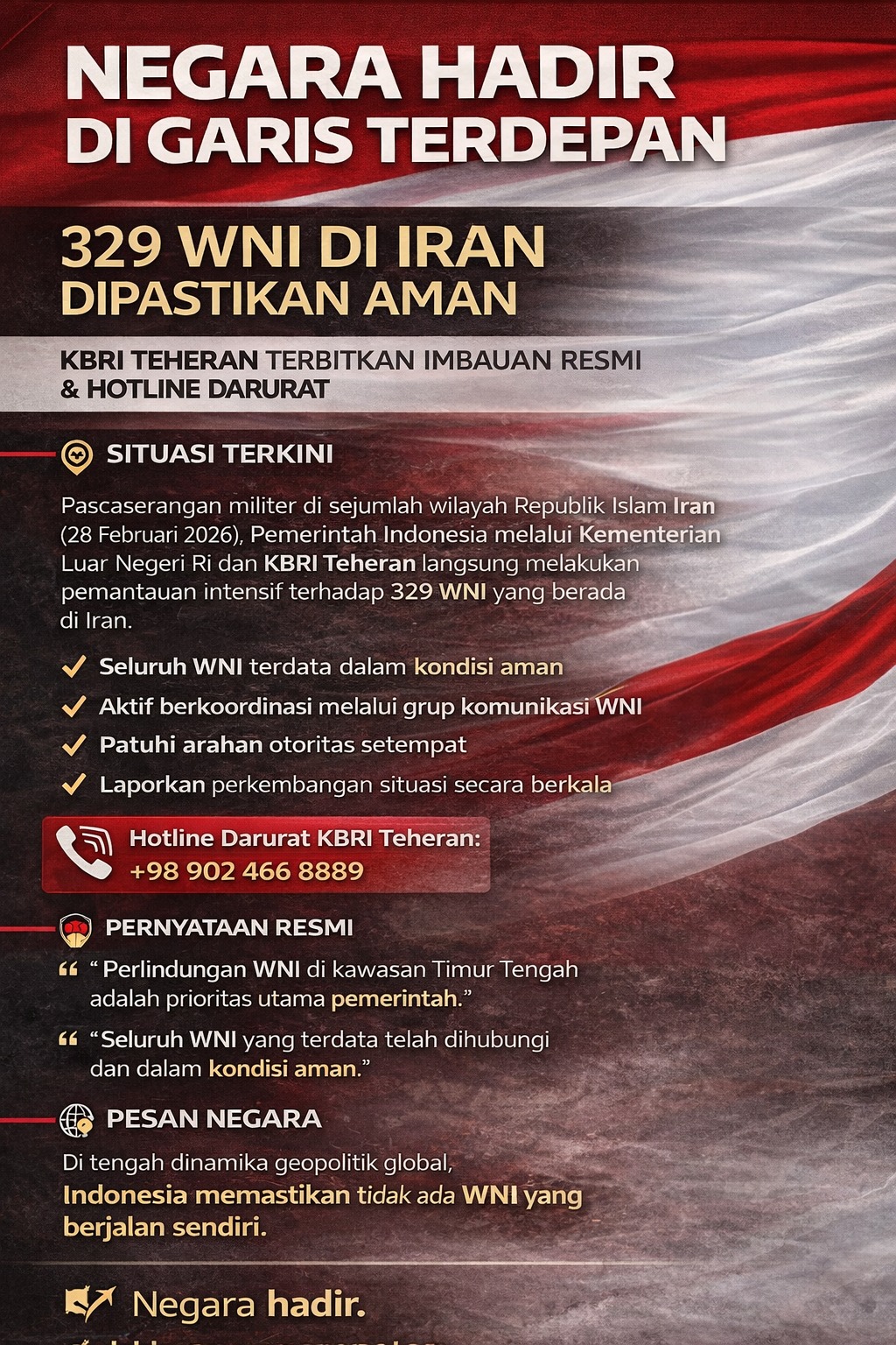 JAKARTA — Kementerian Luar Negeri Republik Indonesia (Kemlu RI) bersama Kedutaan Besar Republik Indonesia (KBRI) di Teheran memastikan pemantauan dan perlindungan intensif terhadap 329 Warga Negara Indonesia (WNI) yang berada di Iran pascakonflik militer yang melibatkan Amerika Serikat dan Israel pada akhir Februari 2026. Langkah cepat ini dilakukan demi memastikan keselamatan WNI di tengah eskalasi kekerasan dan ancaman keamanan yang meningkat di kawasan tersebut.