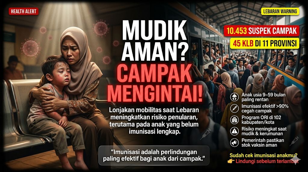 JAKARTA — Menjelang momen Lebaran yang identik dengan kebahagiaan, silaturahmi, dan mobilitas besar-besaran, terselip ancaman kesehatan yang tak boleh diabaikan. Di tengah arus mudik dan kerumunan yang tak terhindarkan, penyakit menular seperti campak kembali mengintai, terutama bagi anak-anak yang belum mendapatkan perlindungan imunisasi lengkap. Situasi ini menjadi pengingat bahwa di balik euforia perayaan, kewaspadaan tetap menjadi kunci utama menjaga keselamatan keluarga.