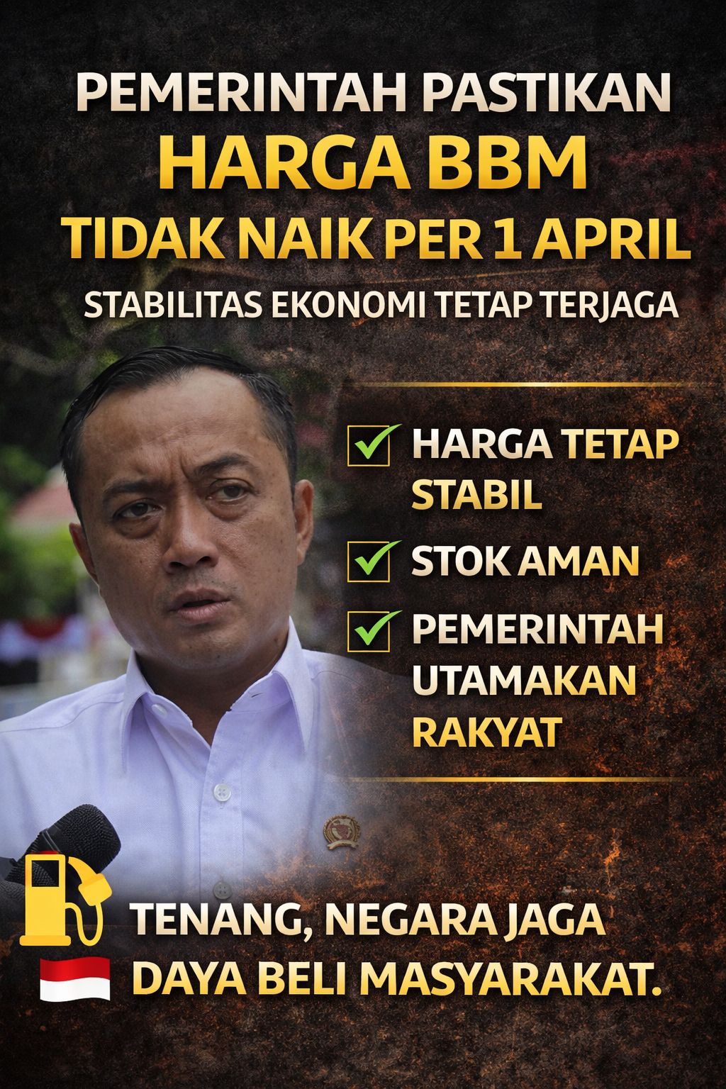 Selain memastikan harga tetap stabil, pemerintah juga menjamin ketersediaan BBM nasional dalam kondisi aman. Masyarakat diimbau untuk tidak panik maupun terpengaruh oleh informasi yang belum terverifikasi. “Tidak perlu resah karena ketersediaan BBM kita jamin dan harga tidak terjadi penyesuaian,” tegas Prasetyo.