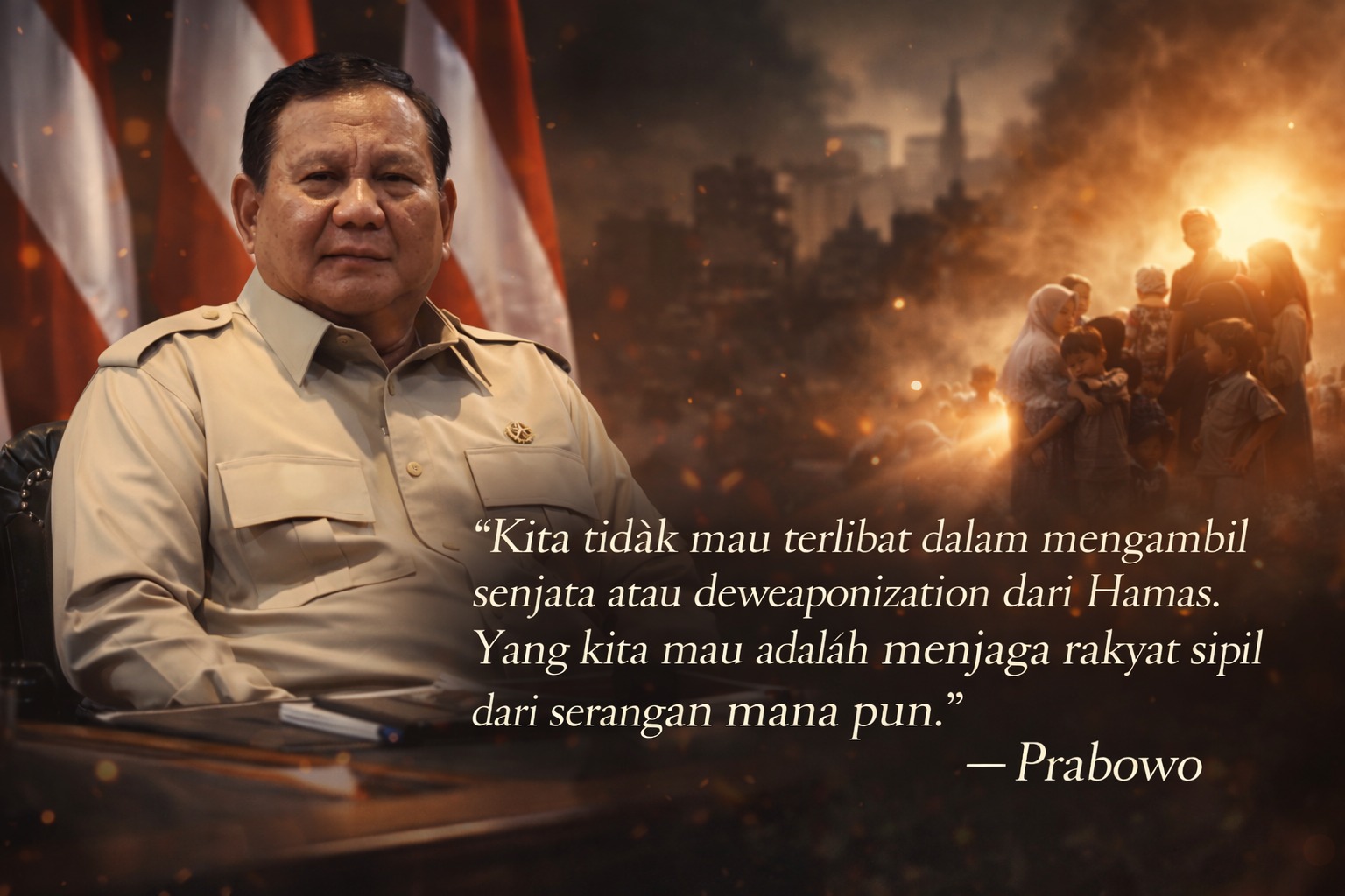“Kita tidak mau terlibat dalam mengambil senjata atau deweaponization dari Hamas. Yang kita mau adalah menjaga rakyat sipil dari serangan mana pun,” ujar Prabowo.