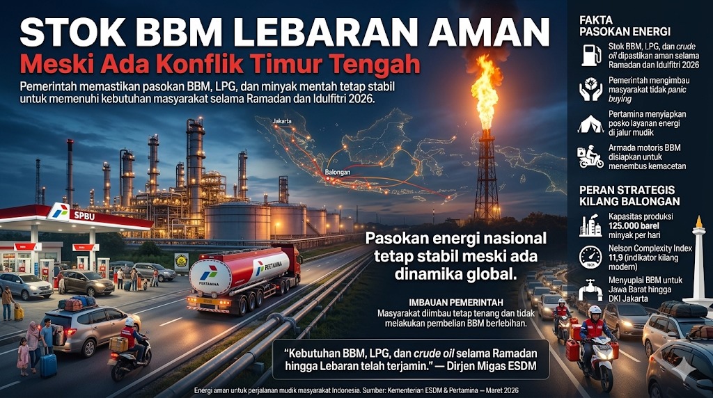 Kepastian ini disampaikan Kementerian Energi dan Sumber Daya Mineral melalui Direktorat Jenderal Minyak dan Gas bersama PT Pertamina. Direktur Jenderal Migas Kementerian ESDM, Laode Sulaeman, menyampaikan bahwa seluruh kebutuhan energi selama masa Ramadan hingga Lebaran telah dipersiapkan dengan baik. Hal tersebut disampaikan saat ia melakukan kunjungan kerja ke Kilang Pertamina RU VI Balongan di Kabupaten Indramayu pada Kamis, 12 Maret 2026. Berdasarkan laporan dari Pertamina, stok BBM, LPG, serta minyak mentah yang dibutuhkan untuk memenuhi konsumsi masyarakat selama periode mudik dan Lebaran telah tersedia dengan cukup. Pemerintah juga mengimbau masyarakat untuk tidak melakukan panic buying karena pasokan energi nasional dalam kondisi terkendali.