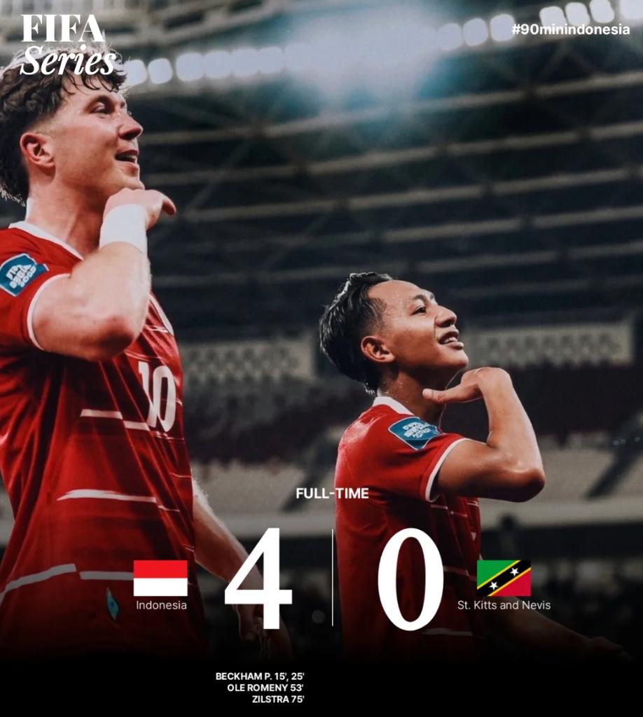 JAKARTA, 27 Maret 2026 — Menteri Pemuda dan Olahraga Republik Indonesia, Erick Thohir, menyaksikan langsung kemenangan Timnas Indonesia atas Saint Kitts and Nevis dengan skor 4-0 pada laga FIFA Series 2026 di Stadion Utama Gelora Bung Karno, Jakarta, Jumat (27/3). Kemenangan ini diraih melalui permainan dominan skuad asuhan John Herdman, yang memastikan langkah Indonesia ke final turnamen.